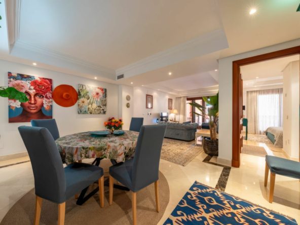 Positioned within a prestigious beachfront development on the highly desirable New Golden Mile between Marbella and Estepona, this spacious three-bedroom apartment offers a refined blend of comfort, lifestyle, and coastal elegance. The property benefits from a registered and transferable Andalusian tourist licence, allowing legal short-term rentals for up to six guests, making it an excellent option for both lifestyle buyers and investor – with current rental income estimated at €45.000 to €50.000 per year.