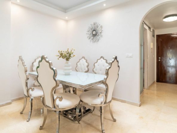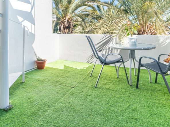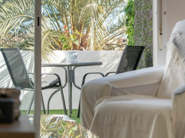 The apartment is in good condition and includes features that add long-term value, such as marble flooring, fitted wardrobes, good orientation, and excellent natural light. The terrace provides a comfortable outdoor area with space for a table and chairs, suitable for year-round enjoyment. The complex also offers a communal swimming pool and landscaped gardens, creating a pleasant and well-cared-for environment.