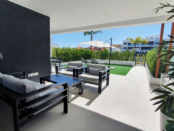 The garden connects directly to the tranquil communal areas featuring beautifully landscaped Mediterranean gardens, swimming pools, jacuzzis, and a children’s play area.