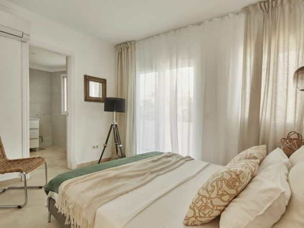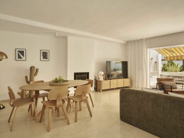 The apartment itself is a two-bedroom unit with a spacious living room and a terrace facing south, overlooking the lovely gardens where you can hear birds singing. The urbanization is stylish, Andalusian, and very well-maintained.