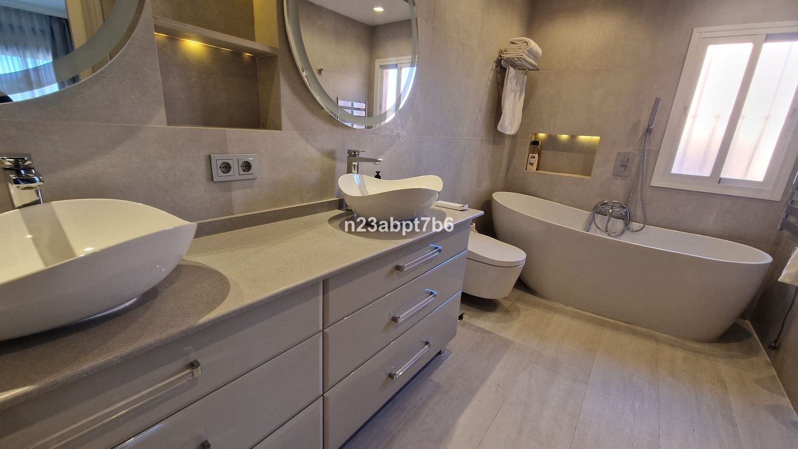 3 double bedrooms, the main one with access to a balcony and an en-suite bathroom. Two additional full bathrooms.