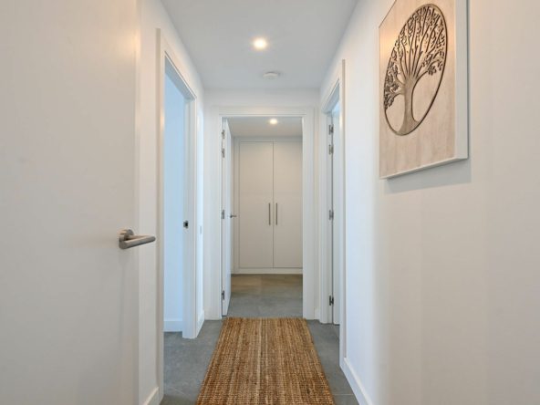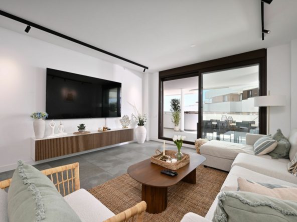 The apartment features a spacious open-plan kitchen and living room, ideal for both relaxing and entertaining. Two of the bedrooms offer direct access to a generous terrace, perfect for enjoying your morning coffee or evening sunsets with a partial sea view.
