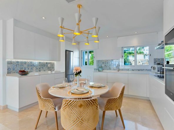 The bright open-plan living and dining area connects seamlessly with the modern, fully fitted kitchen and opens directly onto the terrace — ideal for relaxed Mediterranean living and sunset views.