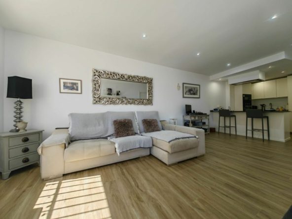 The apartment features a stylish open-plan kitchen with a breakfast counter, flowing seamlessly into the bright lounge and dining area. From here, large glass doors open onto an impressive 45 m² private terrace, perfect for outdoor living, with a lounge area, sunbeds, and views of the surrounding greenery.