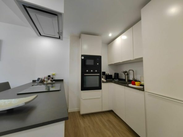 The bedroom is complemented by a modern bathroom with a walk-in shower with glass sliding doors and a wall-mounted toilet. Every detail has been carefully renovated to the highest contemporary standards, including a fully fitted kitchen with quality appliances.