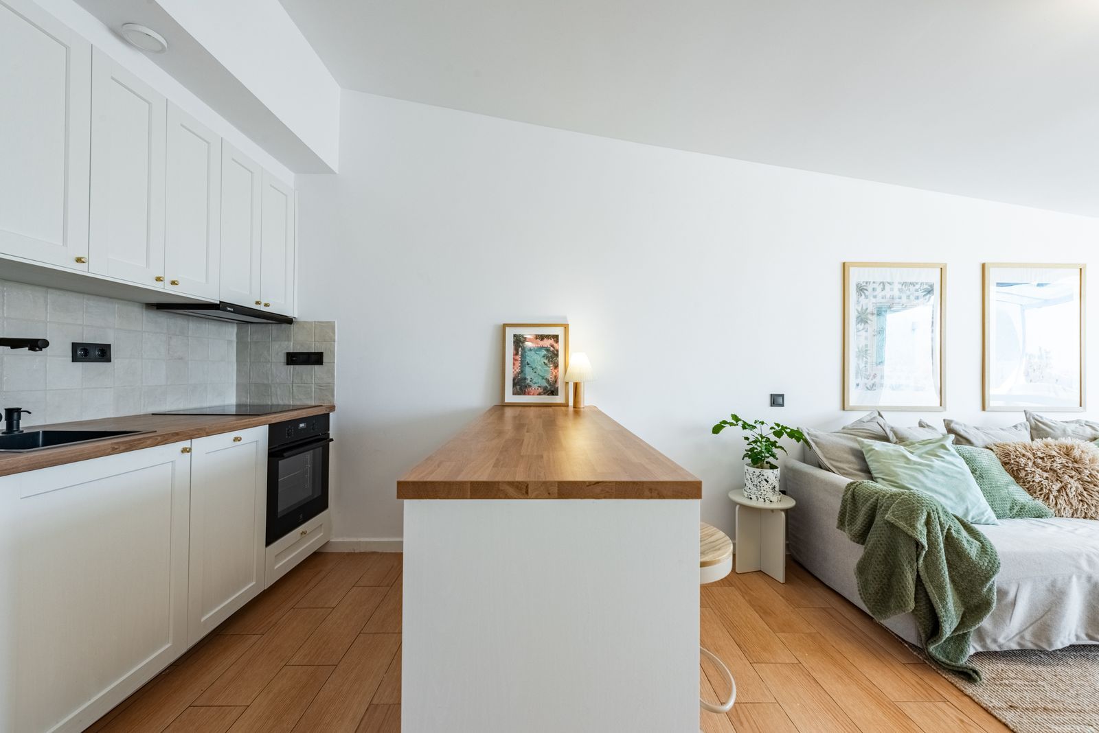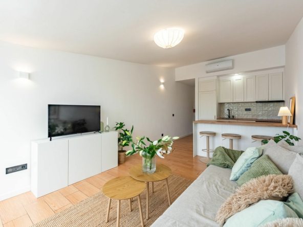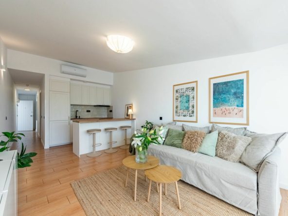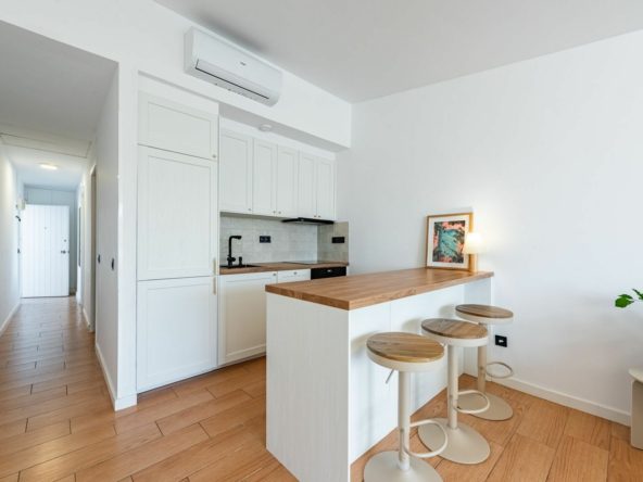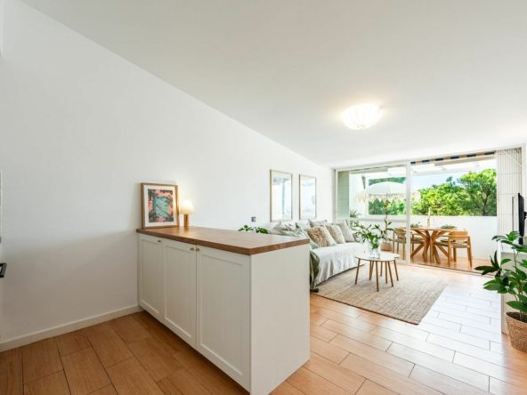 The apartment is situated half a flight up and laid out on one level, featuring a spacious bedroom with built-in wardrobes, a bathroom, and a hallway leading to a stylish open-plan kitchen and living area. From the living room you step out onto the sunny south-facing terrace with beautiful sea views – the perfect spot for relaxation, dining and soaking up the sun all year round. For those who wish, access to a lovely communal pool area is also available for a small fee, ideal during the warm summer months.