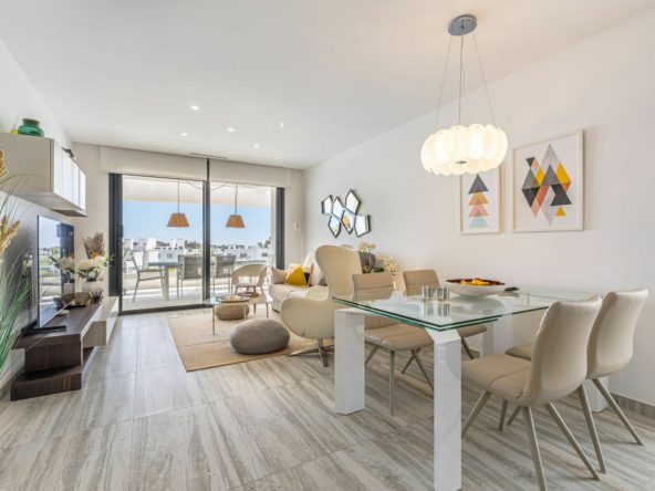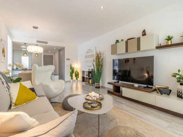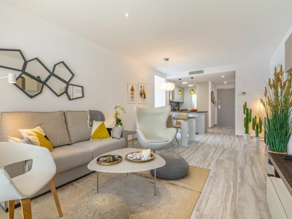 The apartment features two spacious bedrooms and two bathrooms. The modern kitchen is fully equipped with high-quality appliances and also includes a practical utility room. The living room is bright and airy, with large windows and sliding doors that open onto a generous balcony – ideal for relaxing or entertaining.