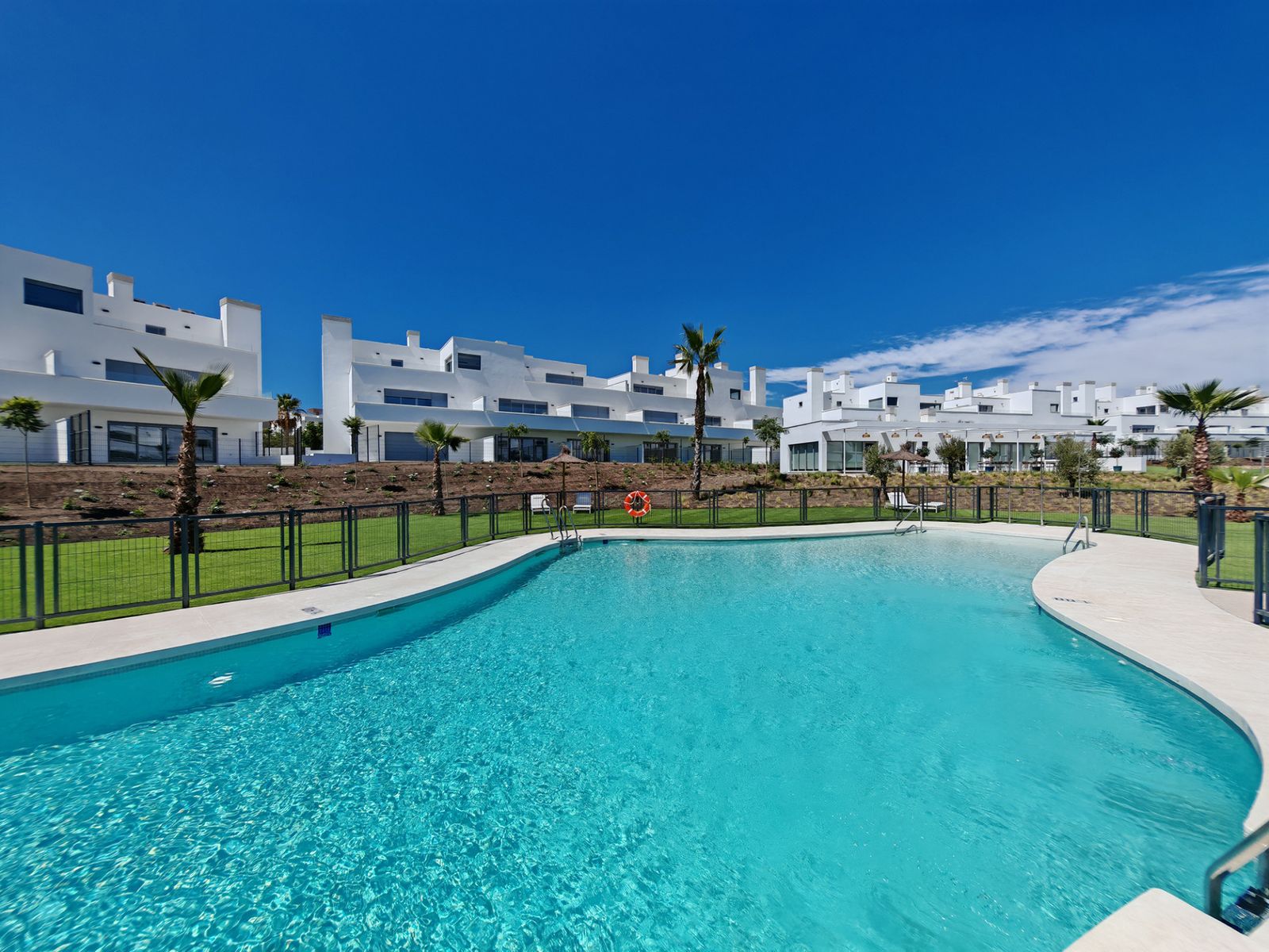 Penthouse for sale in Cancelada, Estepona with 3 bedrooms, 2 bathrooms, 1 on suite bathroom and with orientation south/west, with communal swimming pool, private garage (1 parking spaces) and communal garden. Regarding property dimensions, it has 103.29 m² built and 53.4 m² terrace. Has the following facilities amenities near, transport near, air conditioning, storage room, gym, double glazing, brand new, private terrace, automatic irrigation system, internet – wi-fi, fitted wardrobes, gated community, lift, garden view, pool view, unfurnished, close to children playground, close to sea / beach, close to golf, open plan kitchen, balcony, excellent condition, close to shops and close to schools.