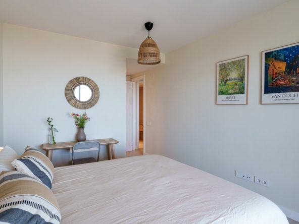 The apartment features two generously sized bedrooms, both filled with natural light and decorated in soothing neutral tones which provides direct access to a private terrace, offering the perfect spot to enjoy your morning coffee or unwind in the evening. The two bathrooms are beautifully designed with contemporary fixtures with underfloor heating