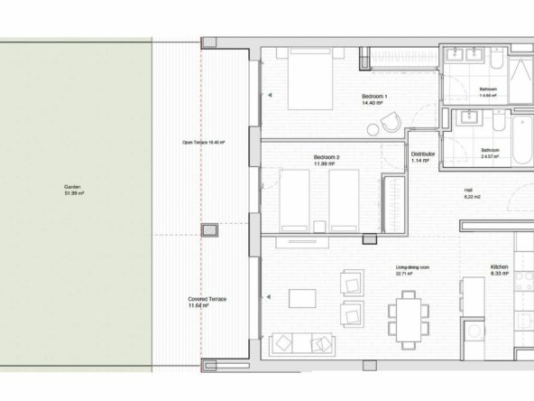 The apartment offers a well-designed contemporary layout with a bright open-plan living and dining area connected to the outdoor spaces. In addition to a generous 29m² of terraces, ideal for outdoor dining and relaxing, the property also benefits from a private 52m² garden, giving it the feel of a small house and making it particularly attractive for buyers looking for ground floor living with usable exterior space.