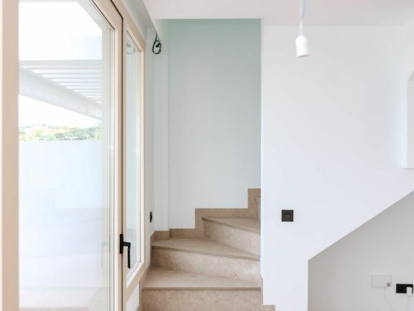 The property is spread over two floors and features a smart layout with double terraces on the main level: one offering open sea views, and the other overlooking the mountains and the communal pool. The bright and spacious living-dining area is filled with natural light, complemented by three bedrooms, all with direct access to the terraces, and two full bathrooms. Upstairs, a private rooftop solarium offers spectacular panoramic sea views — the perfect space to relax or entertain outdoors.