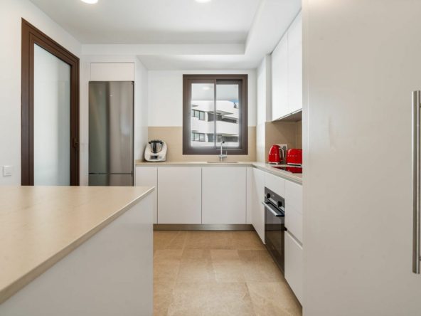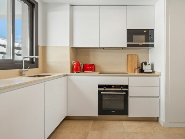 Being a corner unit, the apartment benefits from large windows on multiple sides, allowing natural light to flood the interiors throughout the day. Designed with comfort and style in mind, the apartment offers a bright open-plan living area. From the living room, large sliding doors open onto a spacious south-facing terrace, the perfect place to relax or entertain while enjoying the Mediterranean sunshine.