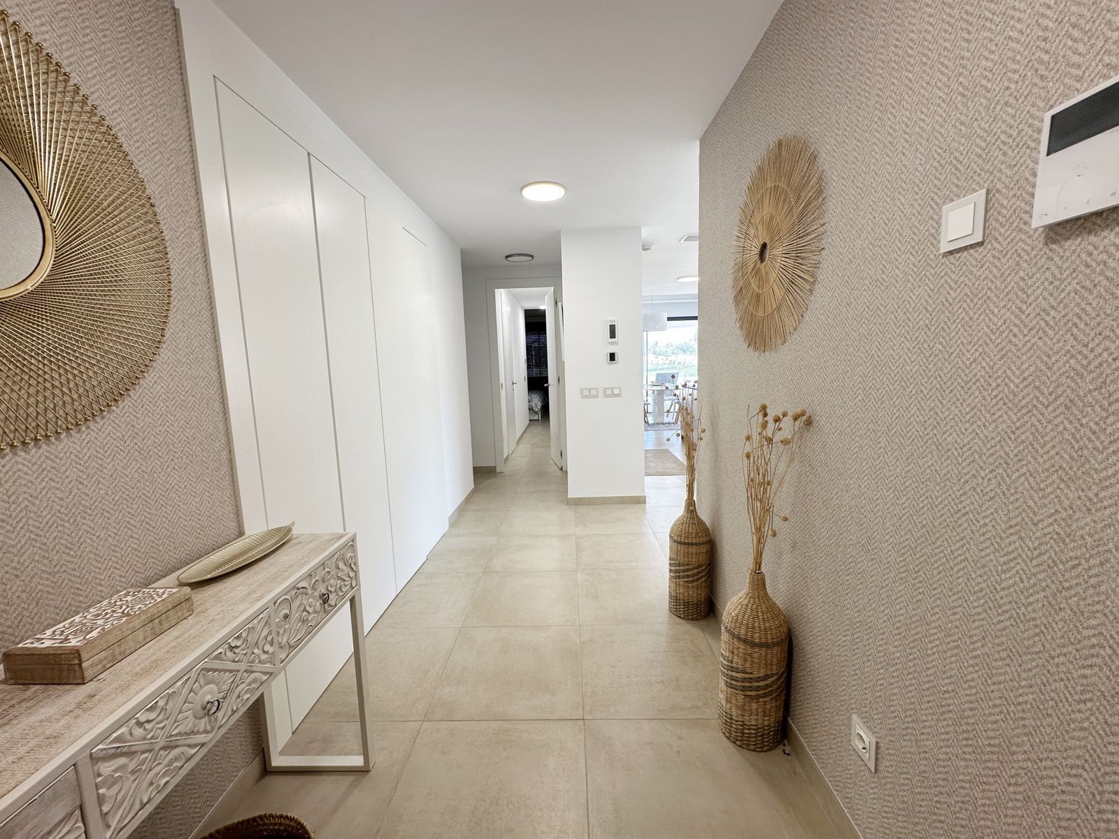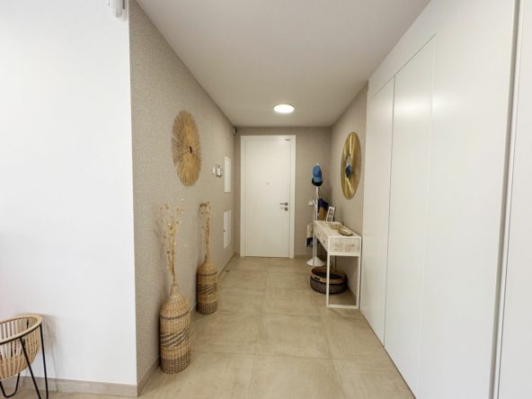 The apartment features an ideal layout with three bedrooms and two bathrooms. The master bedroom includes an en-suite bathroom and direct access to the terrace. Hallways are fitted with ample built-in wardrobes, offering abundant and practical storage space.