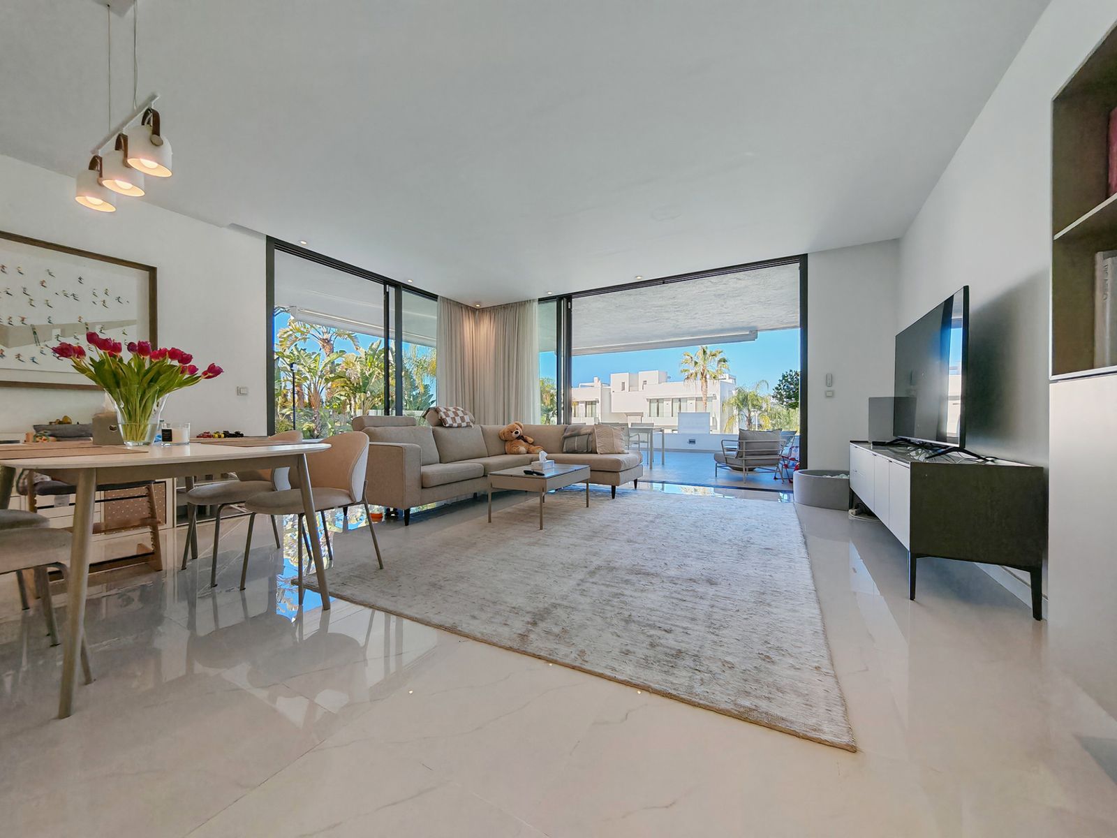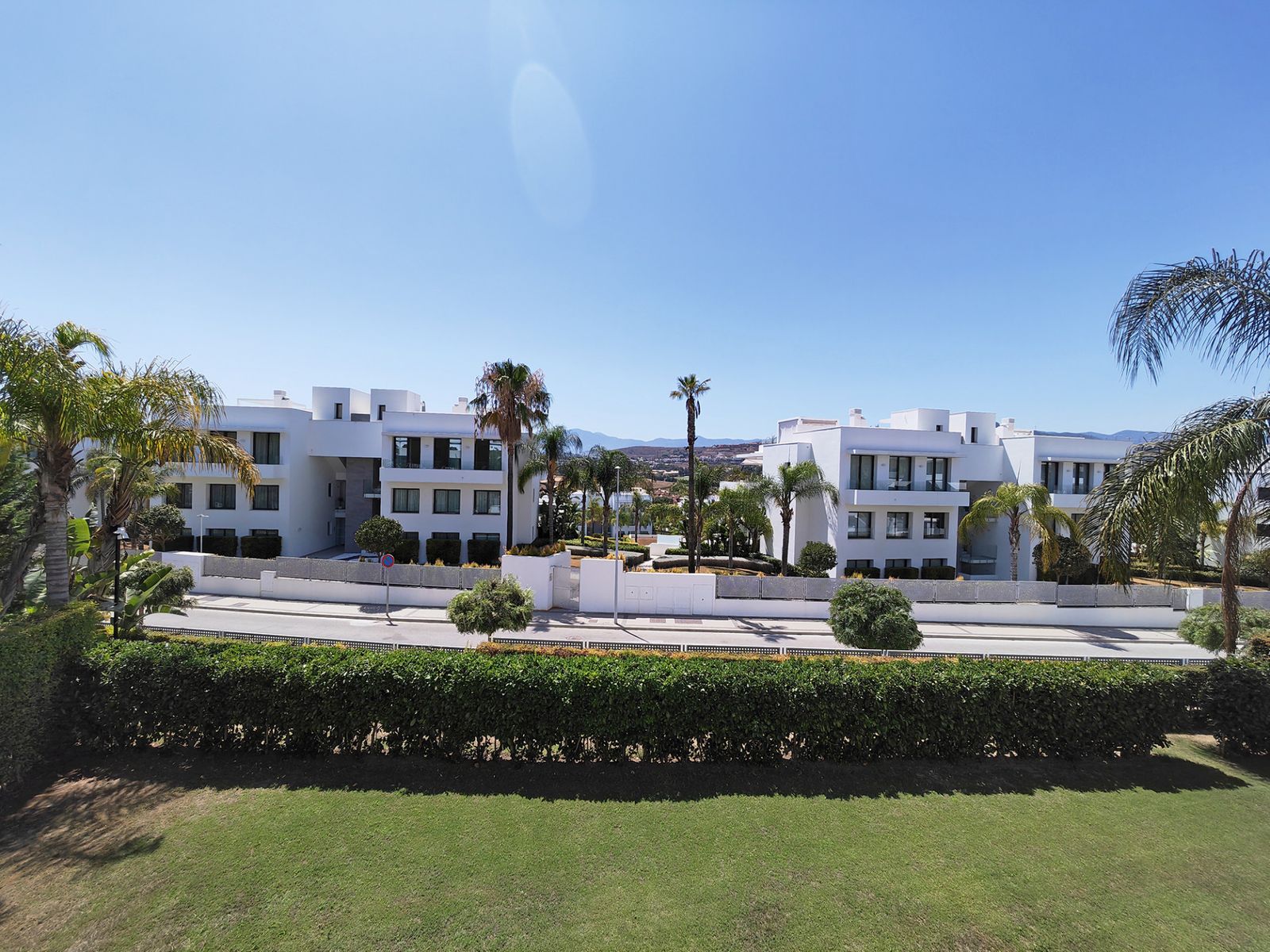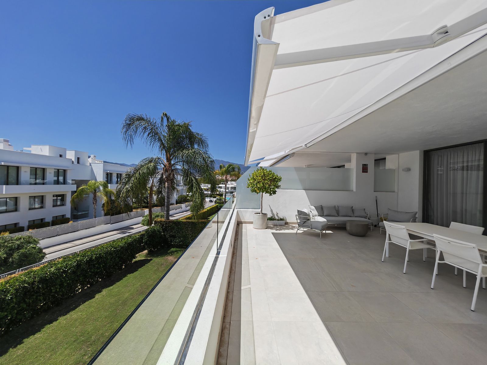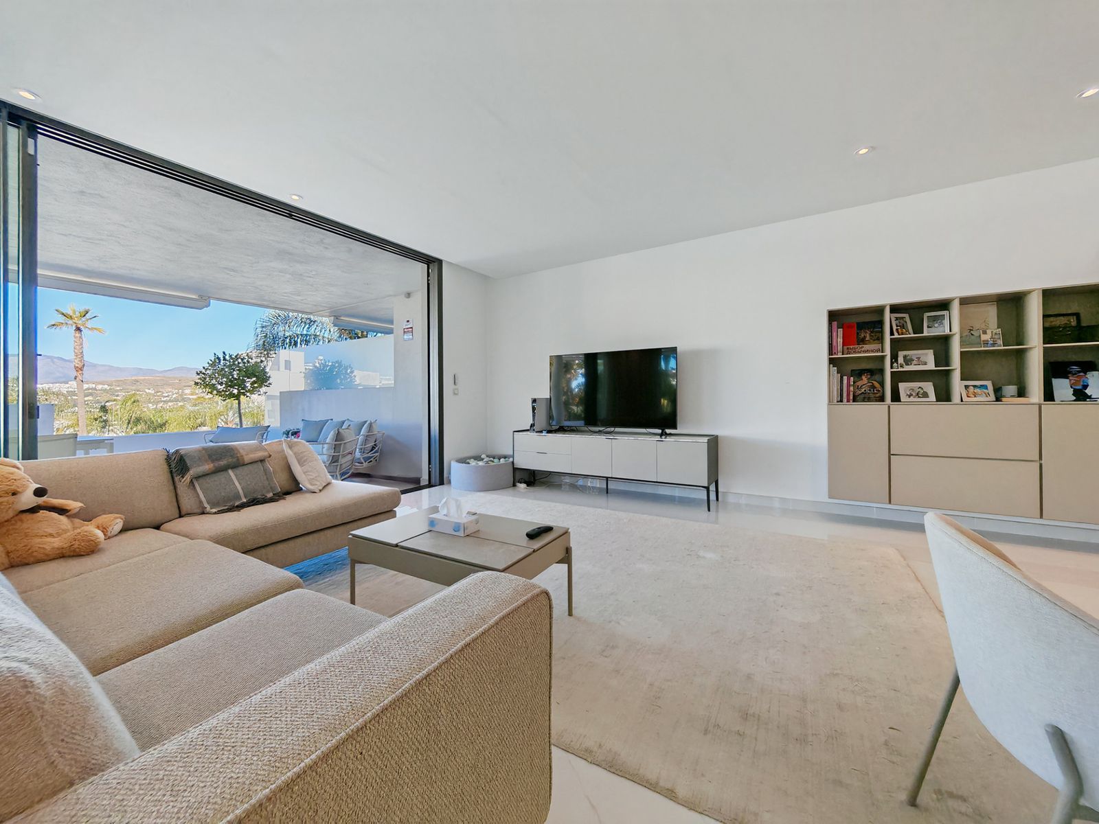 Apartment for sale in Nueva Atalaya, Estepona with 3 bedrooms, 2 bathrooms, 1 on suite bathroom and with orientation west, with communal swimming pool, private garage (2 parking spaces) and communal garden. Regarding property dimensions, it has 122 m² built, 115 m² interior and 78 m² terrace. Has the following facilities front line golf, mountainside, amenities near, air conditioning, central heating, fully fitted kitchen, marble floors, satellite tv, storage room, gym, alarm, security entrance, double glazing, video entrance, dining room, barbecue, security service 24h, private terrace, kitchen equipped, living room, country view, mountain view, golf view, heated pool, automatic irrigation system, security shutters, internet – wi-fi, covered terrace, 24h service, electric blinds, fitted wardrobes, gated community, lift, garden view, panoramic view, doorman, close to children playground, close to sea / beach, close to golf, uncovered terrace, glass doors, balcony, excellent condition, urban view, ceiling cooling system, ceiling heating system, close to shops, close to town, close to port, close to schools, surveillance cameras, inside golf resort and pets allowed.