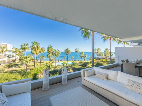 Modern-style apartment located on the beachfront, offering stunning sea views from which to enjoy spectacular sunrises, situated in the magnificent Horizon Beach development and built by the prestigious developer Taylor Wimpey, renowned for its contemporary design and high-quality finishes. The impeccably maintained community provides direct beach access, lush Mediterranean gardens, and an elegant heated outdoor pool for year-round enjoyment, along with refined communal areas designed for relaxation, featuring comfortable loungers and a spacious covered terrace in a privileged setting. Just a 5-minute drive from the center of Estepona and Puerto de la Duquesa, with all services close at hand, it includes a convenient underground parking space and a large storage room located right in front of the parking, making it an excellent beachfront opportunity that must be seen.