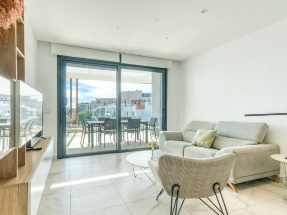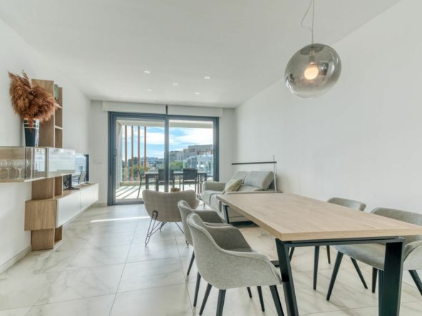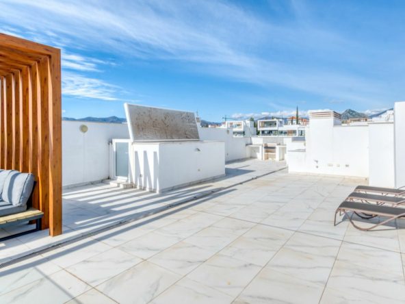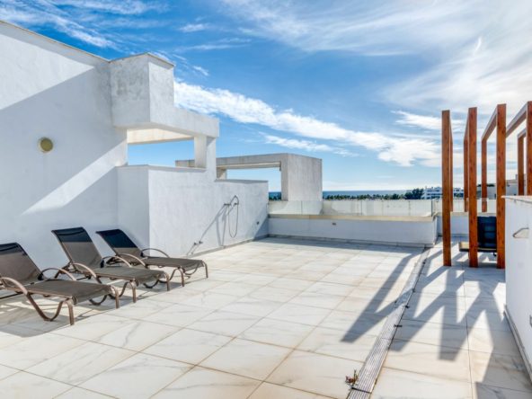 Beautifully maintained and set in an exclusive gated community along Estepona's sought-after New Golden Mile, this penthouse apartment is just 500m from local amenities and a short walk to the beach. Positioned in one of the best spots within the community, the property enjoys fantastic views across the manicured tropical gardens, swimming pool, mountains, and the sea beyond. It’s a calm, elegant space designed for effortless coastal living. Inside, the apartment offers a bright open-plan layout with a sleek American-style kitchen, premium appliances, and underfloor heating in the bathrooms. The spacious living area flows onto a large private terrace perfect for dining outdoors or soaking up the Mediterranean sun. Both bedrooms are generous and filled with natural light, and the master suite opens directly onto the terrace, featuring an en-suite bathroom, while the second bedroom is ideal for guests or family, with a full second bathroom adjacent. A solarium of over 100m2 offers panoramic views ideal for outdoor dining and entertaining.