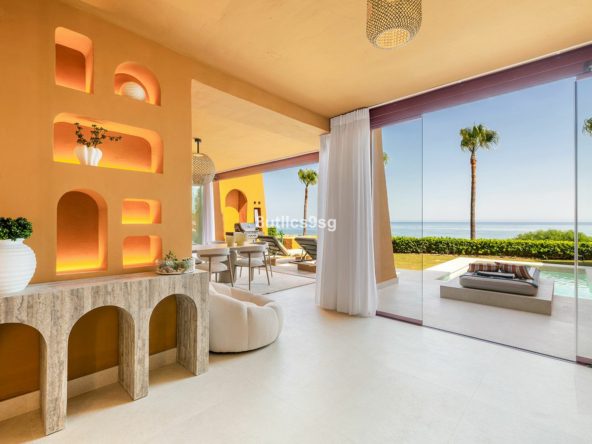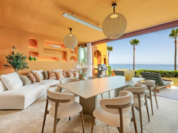 This ground floor apartment is situated in Los Granados del Mar, Estepona East, offering direct access to the beachfront and proximity to local amenities. The property stands out for its generous dimensions, comprising 273m² built area with 186m² of interior space and an 87m² terrace. Its location within a gated community ensures both privacy and security, with 24-hour surveillance and security services in place.