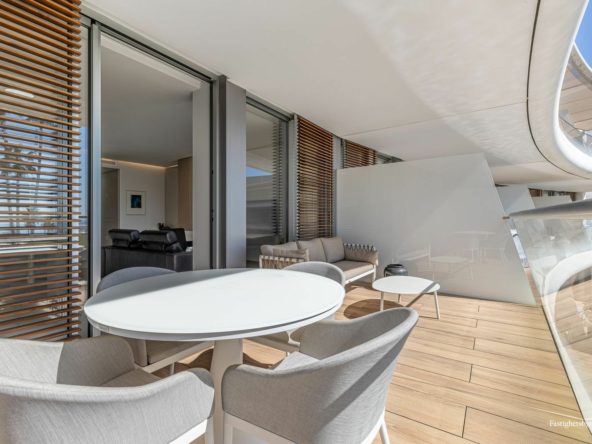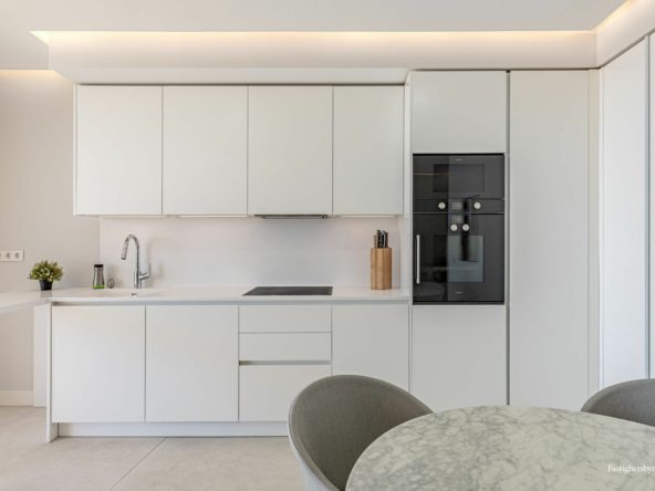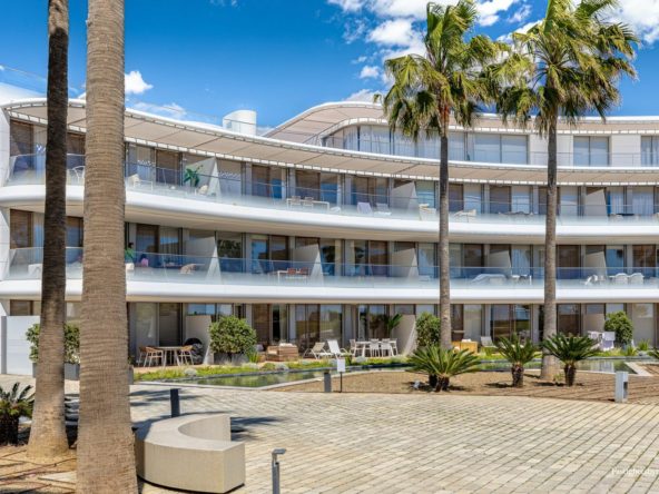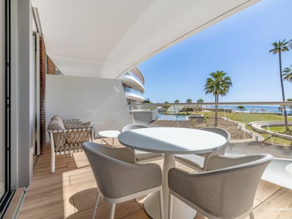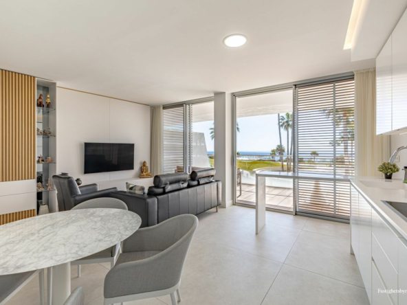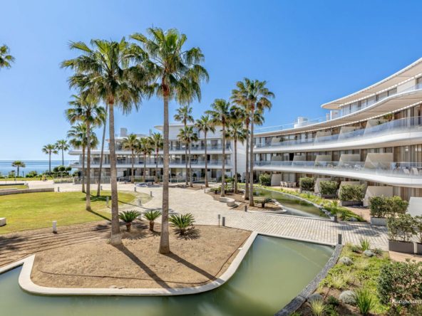 Spectacular sea views, five minutes drive to Estepona and 15 minutes to Puerto Banus. Modern frontline beach development on the beach promenade, consisting of 68 flats. It has very well kept gardens, infinity pool, conference and meeting room, gymnasium and spa area with indoor heated pool, jacuzzi, hamman and sauna. This spectacular and luminous flat where you can enjoy the best views, has two bedrooms, 2 bathrooms with Dombracht finishes and 2 terraces, the main one with views to the garden and the sea, as well as a spacious open plan living room-kitchen with prestigious Gaggenau appliances, garage, storage room and 24h security. This luxury flat is perfect given its privileged location and the high end services it offers to become your new home. Come and see it.
