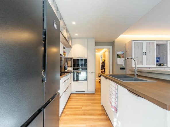 Bathed in natural light, the apartment features two terraces facing south and east, allowing you to enjoy the sun from morning to afternoon while overlooking the tranquil pool area, a true urban oasis that evokes a resort-like ambiance in the middle of town. The open-plan layout seamlessly connects the spacious living room with the modern kitchen, creating a bright and sociable atmosphere. With four bedrooms and three bathrooms, there is ample space for both family and guests, all designed in a clean, contemporary style.