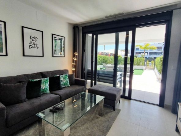 This stunning ground-floor apartment in Los Miradores del Sol Phase I perfectly combines contemporary luxury with Mediterranean indoor-outdoor living on Estepona’s exclusive New Golden Mile. Offering 92 m² of elegant interior space and an impressive 84 m² of private terraces and gardens, it’s ideally located just a short walk from the beach, shops, and restaurants.
