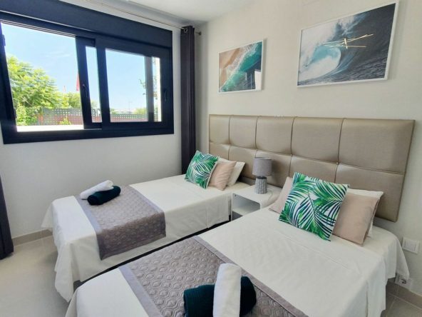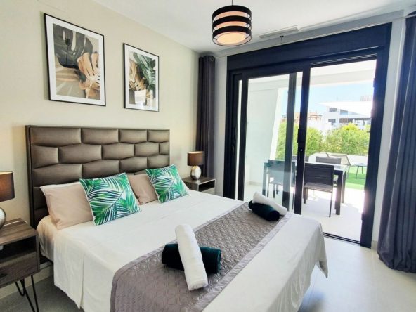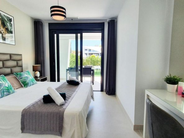 The garden connects directly to the tranquil communal areas featuring beautifully landscaped Mediterranean gardens, swimming pools, jacuzzis, and a children’s play area.