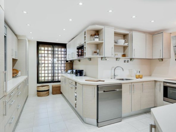 The separate kitchen is spacious and well-equipped, offering plenty of room for shared cooking and social gatherings.