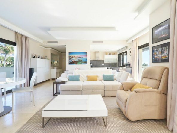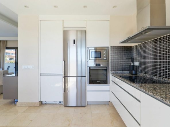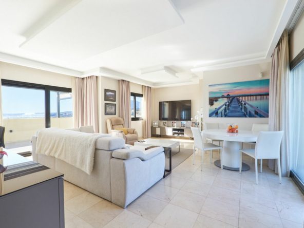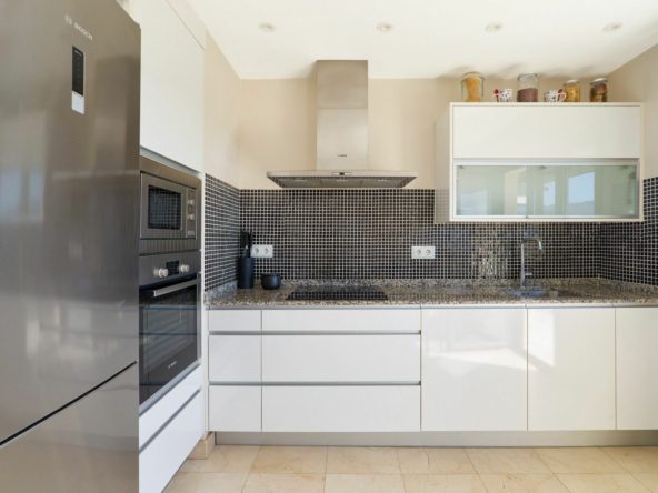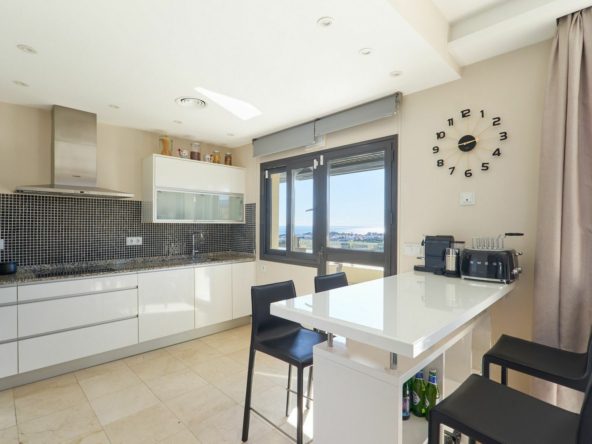 The penthouse has two spacious bedrooms and two bathrooms, providing privacy and comfort. The third bedroom has been converted into a dressing room. The fully fitted open plan kitchen has modern appliances that seamlessly connect with the living areas. The property is in excellent condition, reflecting the meticulous maintenance and attention to detail.