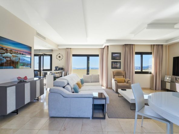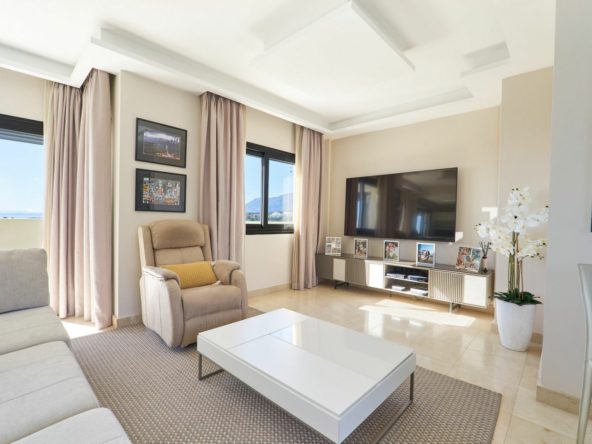 The highlight of this penthouse is the outdoor living with its private terrace offering panoramic views of the sea, mountains, golf courses. Residents can also enjoy three communal swimming pools and a beautiful garden, as well as access to a tennis/paddle court, mini golf. The property is part of a gated community with a secure entrance, video intercom and lift, providing peace of mind and convenience. Additional features include electric blinds, double glazing, storage and fibre internet.