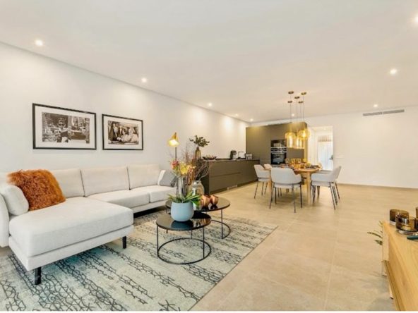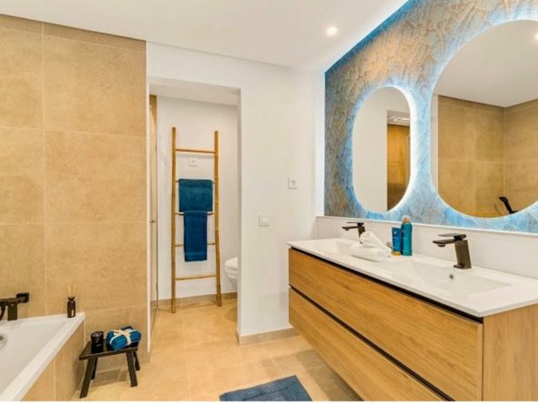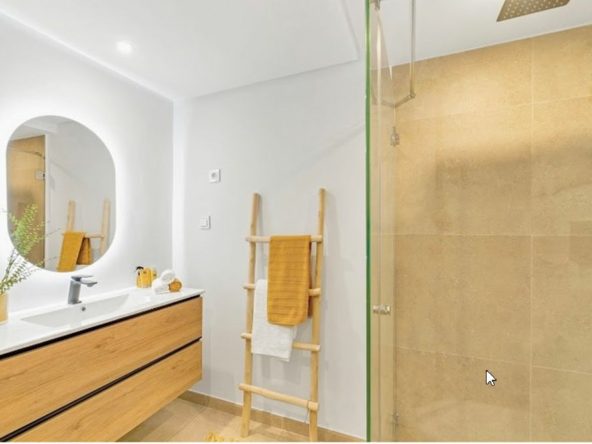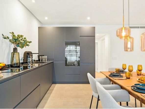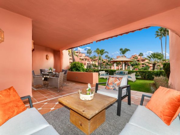Ground Floor Apartment for sale in Cabo Bermejo, Estepona with 3 bedrooms, 2 bathrooms, 1 on suite bathroom, 2 toilets and with orientation south/east, with communal swimming pool, private garage and communal garden. Regarding property dimensions, it has 130 m² built and 40 m² terrace. Has the following facilities front line beach, transport near, air conditioning, fully fitted kitchen, marble floors, guest room, storage room, dining room, security service 24h, guest toilet, private terrace, kitchen equipped, living room, underfloor heating (throughout), fitted wardrobes, gated community, lift, garden view, pool view, beach side, underfloor heating (bathrooms), close to sea / beach, close to golf, glass doors, recently renovated / refurbished, close to shops, close to town and pets allowed.