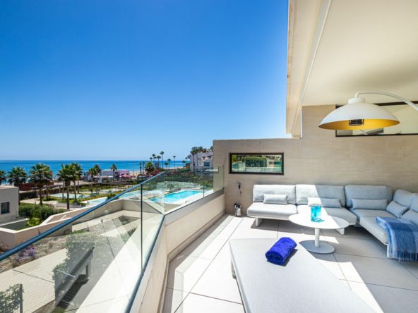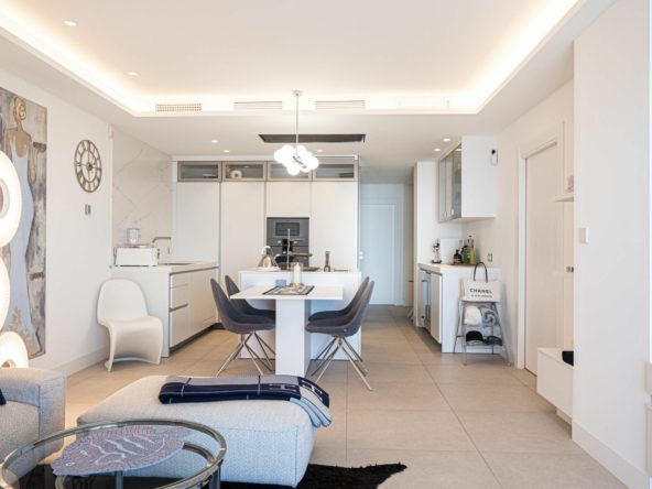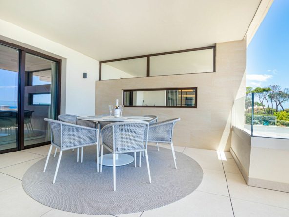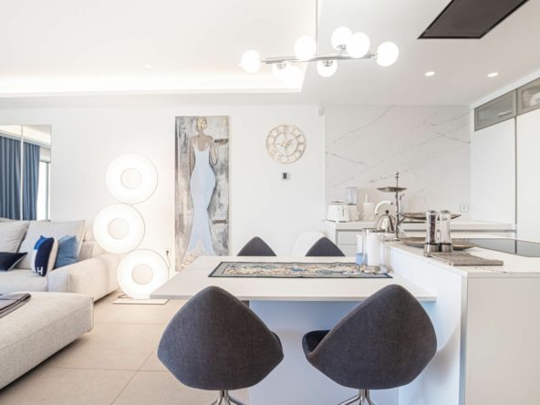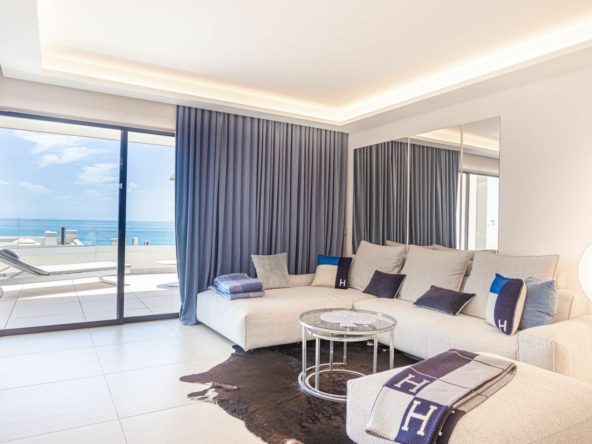 This is a perfect apartment by the sea, consisting of 2 bedrooms and 2 bathrooms, an open kitchen with an island, and a salon from where you can enjoy a magnificent view of the Mediterranean Sea. The sitting area and the master bedroom are connected to the 40m2 covered terrace. The apartment is located on the 1 floor, south facing. There is an underground garage and store room.
