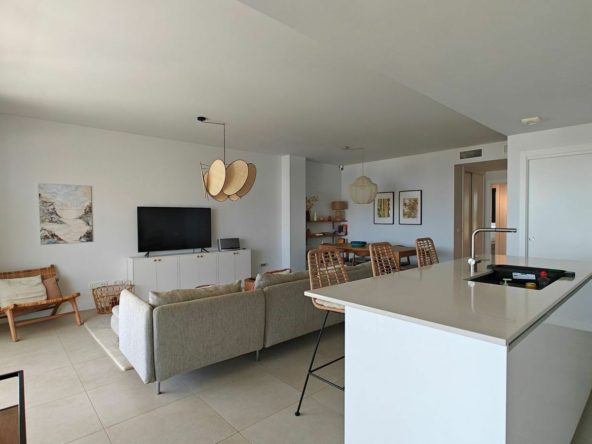 This rare four-bedroom home spans 112 m² of living space plus a generous 43 m² terrace with south, southeast and west orientation, ensuring sun and shade throughout the day. The west-facing section overlooks the communal pool area, while the rest enjoys breathtaking sea views. The open-plan kitchen flows seamlessly into the bright living-dining room, with direct terrace access from the kitchen, lounge and two bedrooms. The other two bedrooms enjoy mountain views and abundant natural light through large windows.
