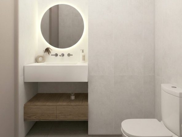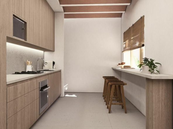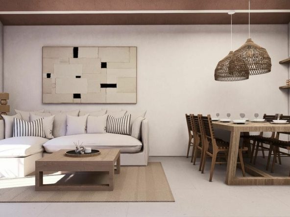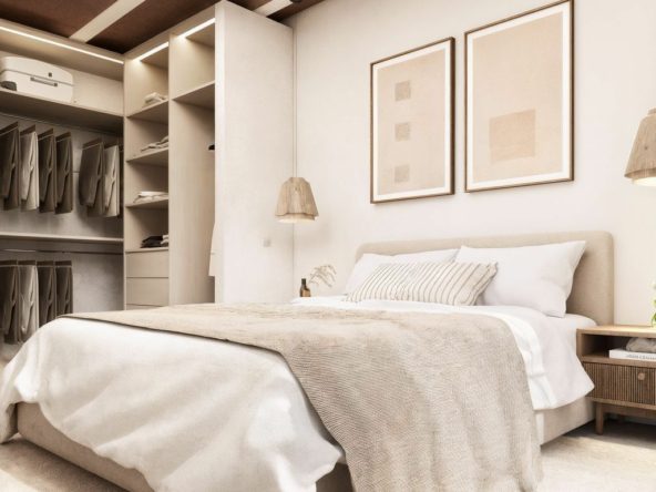 The project blends a contemporary interpretation of Andalusian architecture with a modern, refined design. The palette of neutral tones, warm whites, and natural wood creates an elegant and timeless aesthetic.