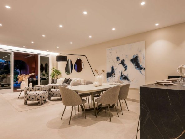 This south facing 3 bedroom and 3-bathroom ground floor apartment has been fully renovated to the highest standards and offers delightful views of the lush landscaped gardens. With a total built area of 142 m2 and a spacious private terrace of 60 m2, this apartment provides an ample and luxurious open living space. It features elegant floors, a brand-new designer kitchen with Miele appliances, a Bang & Olufsen sound system, tailormade wardrobes and an electric fireplace. It is ideal for people who are looking for refined luxury beachfront living at its best.