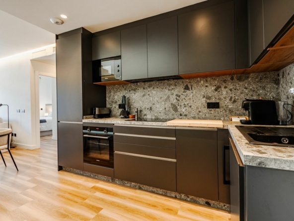 The property offers approximately 76 m² and is distributed into an entrance hall, a bright living room integrated with a fully equipped open-plan kitchen, two bedrooms, and a full bathroom, creating a modern, open, and very welcoming space.