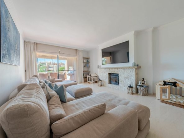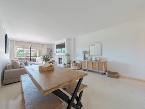 With polished marble floors, a modern kitchen, and a cozy fireplace, the open-plan living and dining area connects smoothly to a large, covered terrace — made for easy indoor-outdoor living