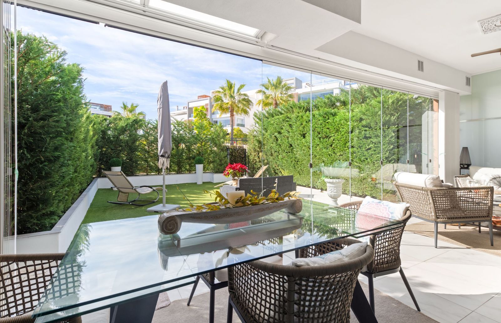 One of the highlights is the bright glass-enclosed terrace, creating an additional living space that can be comfortably used all year round. From here, you access a private garden, offering a great sense of space and privacy.