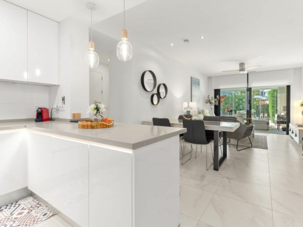 The property features a modern and functional open-plan layout, combining kitchen and living area. The fully equipped kitchen has direct access to an east-facing terrace, perfect for enjoying sunny mornings.