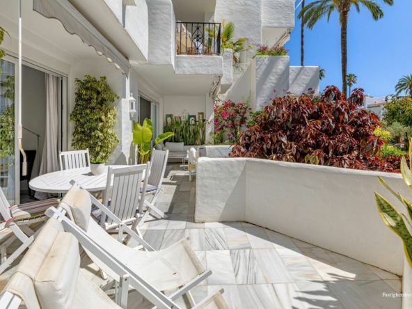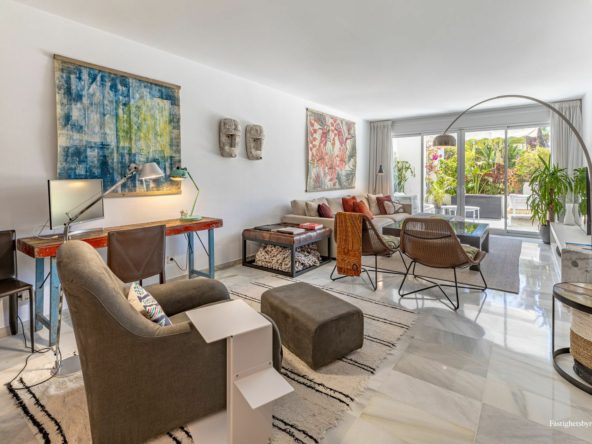 Alcazaba Beach magnificent apartment with large terrace, garden, swimming pool and partial views to the Mediterranean, in exclusive beachfront urbanization, with direct access to the beach, beach bar and restaurant on site, communal parking, 24 hour security, beautiful tropical gardens very well kept, 6 swimming pools (one heated), tennis and paddle courts. It is located on the outskirts of Estepona, with all kinds of services around and only 5 minutes drive from the marina and 10 minutes from Puerto Banus.