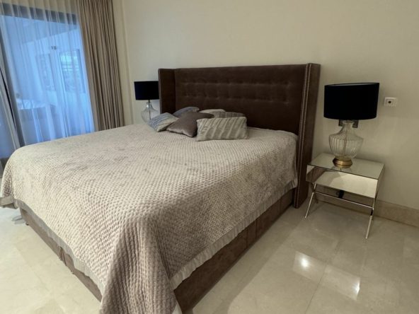 An elegant 2-bedroom, 2-bathroom apartment for sale in the prestigious beachfront development of Doncella Beach, ideally located on the first line of the sea in Estepona.