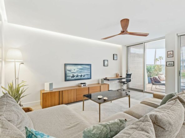 Spanning 121 m² of built space (103.58 m² usable), this bright and spacious south-facing residence boasts uninterrupted sea views and effortless accessibility via a lift, perfect for all ages. The open-plan living-dining area flows seamlessly onto a generous 35 m² terrace and a private 32.2 m² garden, creating an idyllic outdoor oasis for relaxation or entertaining. The fully equipped kitchen features premium Gaggenau appliances, while the master bedroom includes an en-suite bathroom, built-in wardrobe, and direct garden access. The second bedroom offers a fitted wardrobe and similar garden entry. All high-end furniture is included, complemented by aerothermal energy systems, underfloor heating, air conditioning, and domotic-controlled blinds for modern efficiency and comfort. Additional perks include a 7 m² storage room and dedicated parking space.