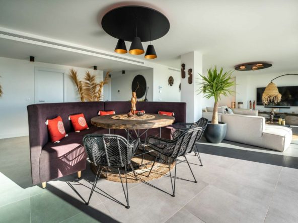 This newly built 250m² south-facing apartment blends modern design with relaxed Boho charm. Featuring 3 spacious bedrooms, each with its own ensuite bathroom, and a 70m² terrace offering breathtaking 180° sea views of Gibraltar and the Atlas Mountains, this is a rare find.