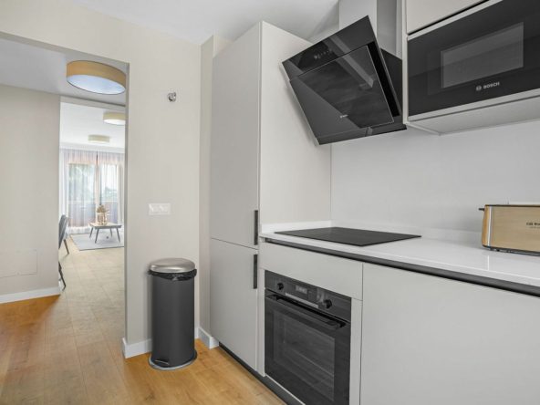 Step inside to discover a beautifully designed interior flooded with natural light, thanks to expansive floor-to-ceiling glass doors that open onto a generous terrace. The contemporary kitchen is fully equipped with premium appliances and ample workspace, ideal for both entertaining and everyday living.
