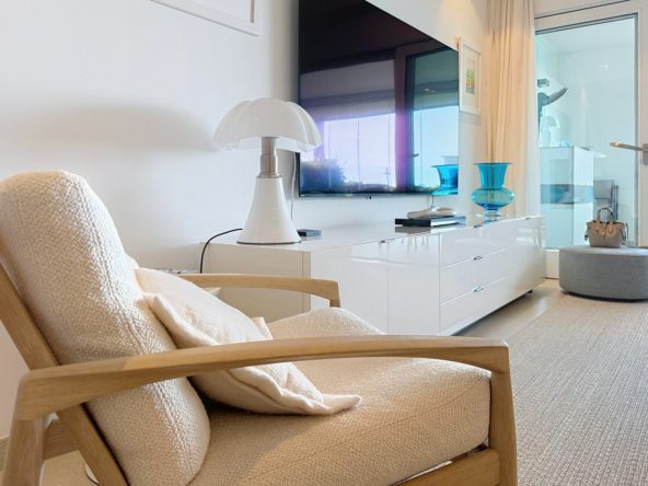 Every detail reflects sophistication and comfort: the spacious open-plan living area connects effortlessly to an expansive glass-enclosed terrace, creating a seamless flow between indoor and outdoor spaces. It’s the ideal setting to enjoy sea views all year round — from serene mornings to sunset dinners framed by the horizon.