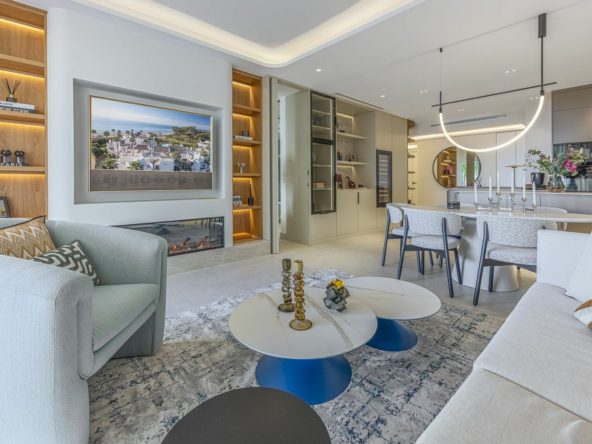 The living space extends onto a generous 23 square metre private terrace, where panoramic views of the sea and the meticulously maintained tropical gardens, create a truly captivating backdrop. From here, there is direct access to the beachfront promenade, offering the perfect setting for leisurely coastal walks or a refreshing swim in the Mediterranean. The property further benefits from two underground parking spaces and two private storage units, ensuring both convenience and practicality.