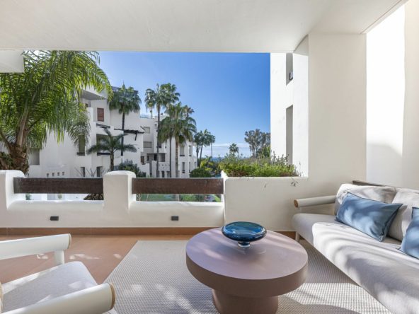 This outstanding sea view apartment is set within a secure and exclusive beachfront community on the highly sought-after New Golden Mile. An elegant second-floor apartment, it enjoys a privileged position between Marbella and Estepona, and is perfect to enjoy theb wonderful Mediterranean lifestyle. Beautifully renovated throughout, and spanning 122 square metres, the apartment has been meticulously refurbished and tastefully furnished to the highest standards. It comprises three well-proportioned bedrooms and two elegant bathrooms, including a luxurious en suite to the master. The interiors are defined by a spacious open-plan layout, seamlessly integrating a fully equipped kitchen, dining area, and sophisticated lounge—an inviting setting equally suited to quiet relaxation and stylish entertaining.
