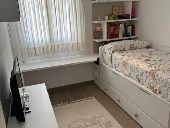 The kitchen is independent but has custom-made sliding doors that open outwards, allowing it to be connected to the living-dining room when desired, without taking up space and creating a sense of openness and flow. The apartment offers three bedrooms with fitted wardrobes, the main one with an en-suite bathroom, plus a second full bathroom.