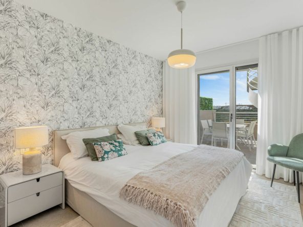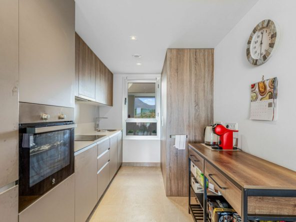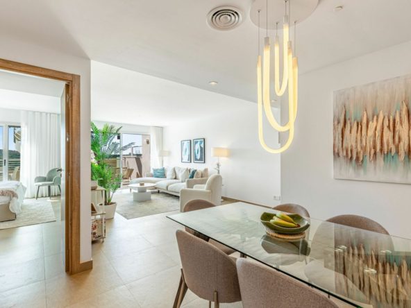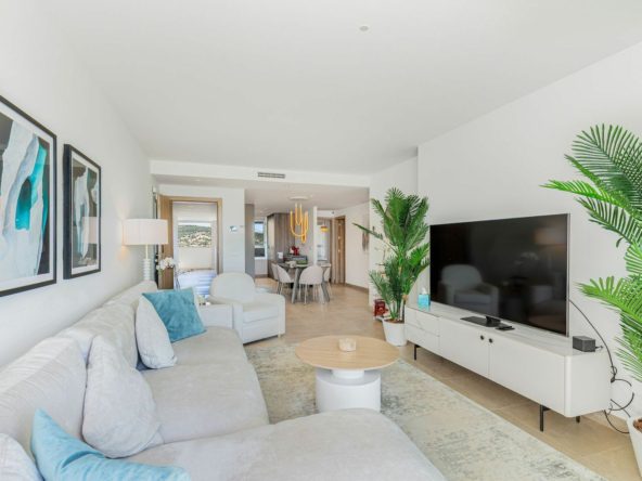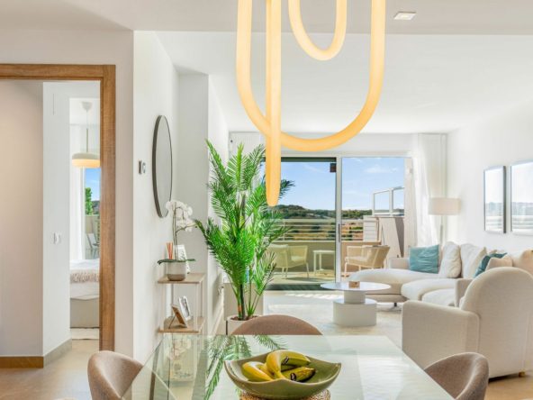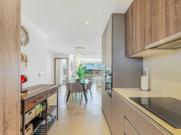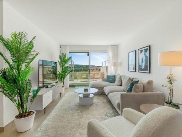 This bright and spacious south-facing penthouse in the Sunny Golf complex boasts panoramic views of the golf course, sea, and mountains from its impressive 76 sqm private solarium — an ideal space to unwind and soak in the scenery. Featuring 2 bedrooms, 2 bathrooms, an open-plan kitchen and a sunlit living area that opens onto a generous terrace, the property blends comfort and elegance. It comes fully furnished with stylish, high-quality furniture and is finished to an exceptional standard — ready to move in.