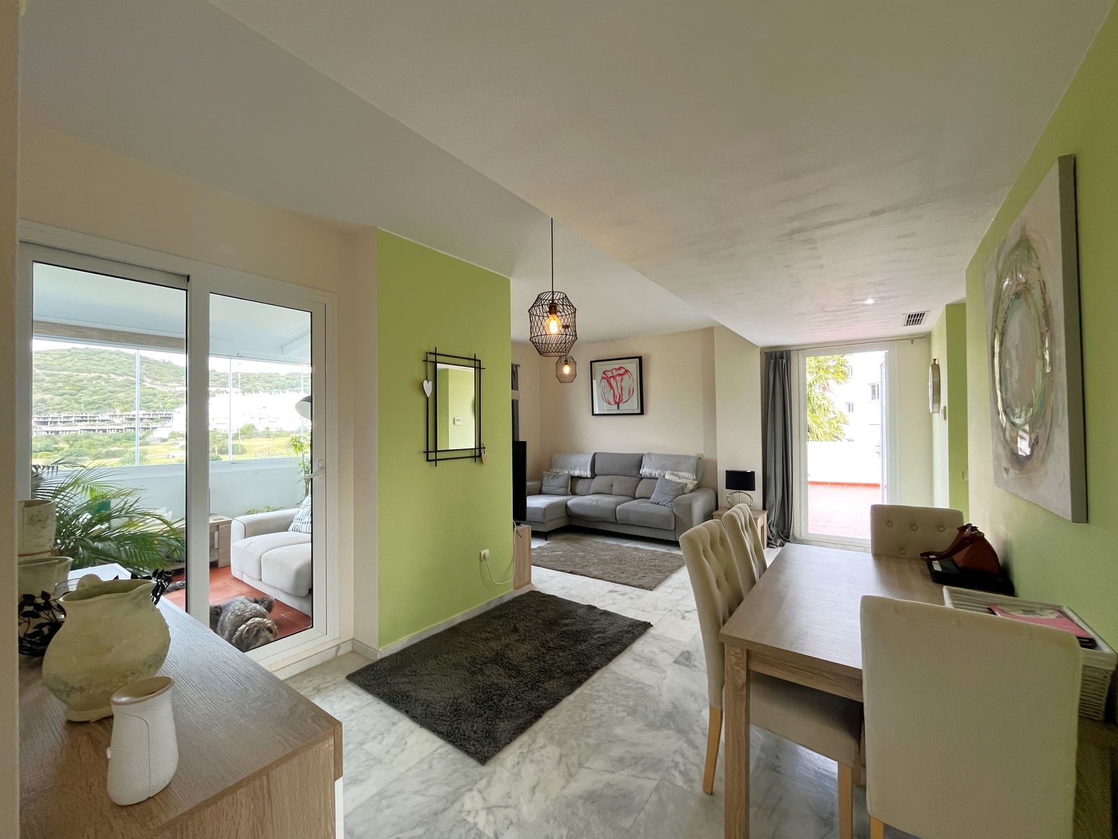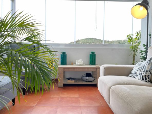 The property stands out for its large wrap-around terrace with stunning open views of the golf course and the mountains, the perfect spot to enjoy the sun and peace. Upon entering, you will find a bright and spacious living-dining room with access to a glass-enclosed terrace with sliding curtains, ideal as an additional living area. It also features a fully renovated and equipped kitchen with high-quality finishes.