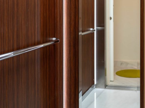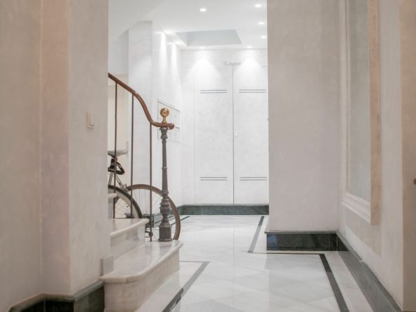 The property occupies the top floor of a rehabilitated building and benefits from private lift access directly into the apartment. For visitors, the lift reaches the third floor, followed by one additional flight of stairs leading to the entrance door of the penthouse.