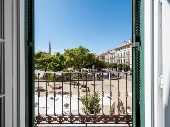 The tall wooden-framed windows feature colourful stained-glass details that project a prismatic play of light over stately rooms and frame expansive views of Plaza de la Merced. The newly installed exterior carpentry, with soundproofing, guarantees a peaceful refuge in an unmatched central location. The property includes five elegant French balconies.
